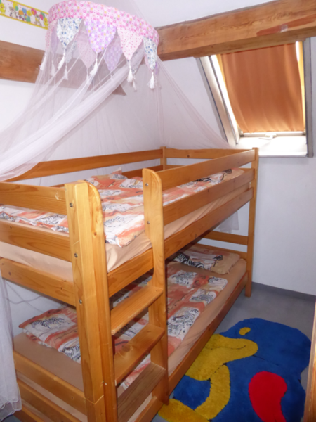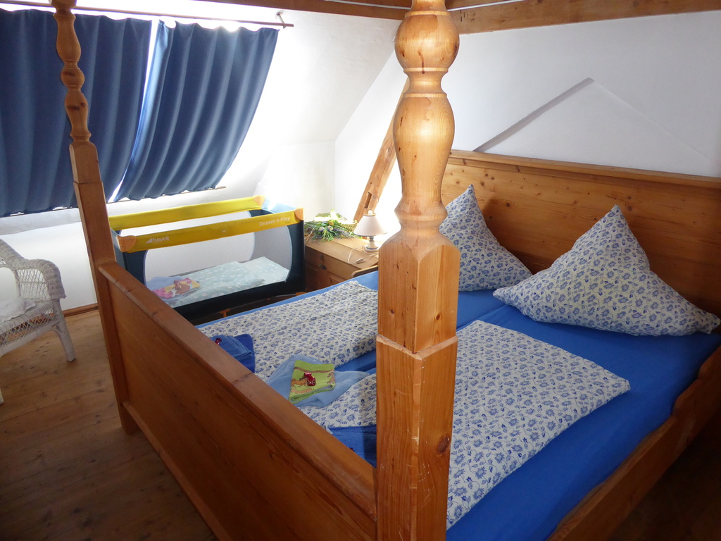 Elternschlafzimmer mit Himmelbett, separates Kinderzimmer und Dusche mit WC